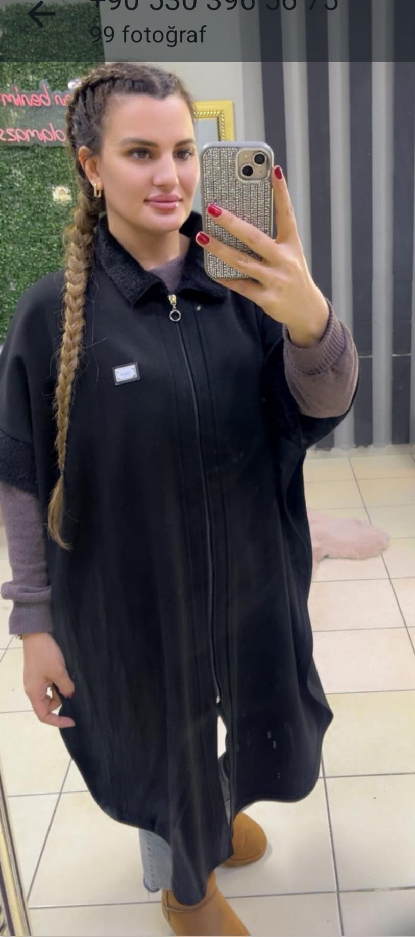 Boyun ve Kol Detayı Siyah Kürklü Detaylı Panço