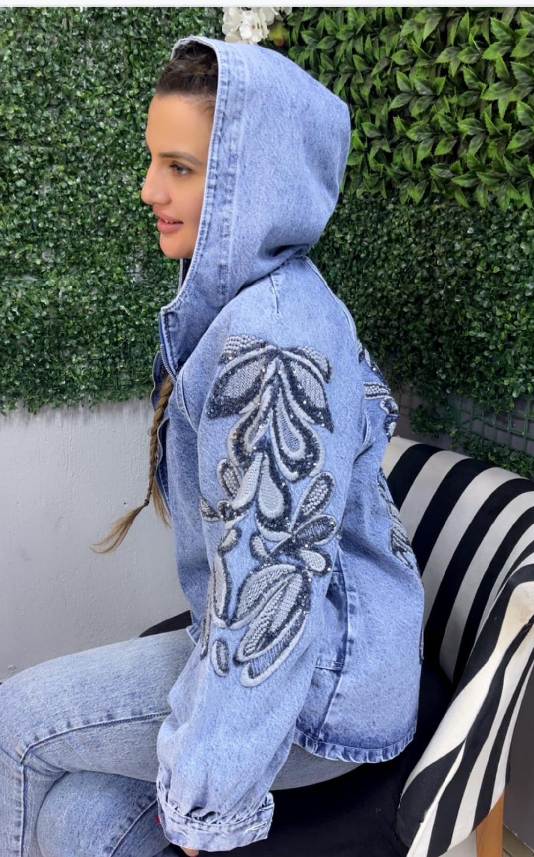 Nakışlı Pullu Salaş Kot Ceket Mavi