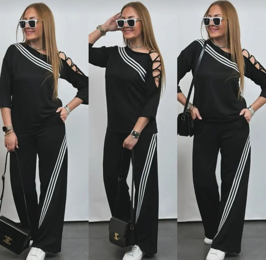 Omuz Şeritli Ribana Detaylı Siyah 2'li Eşofman Takım