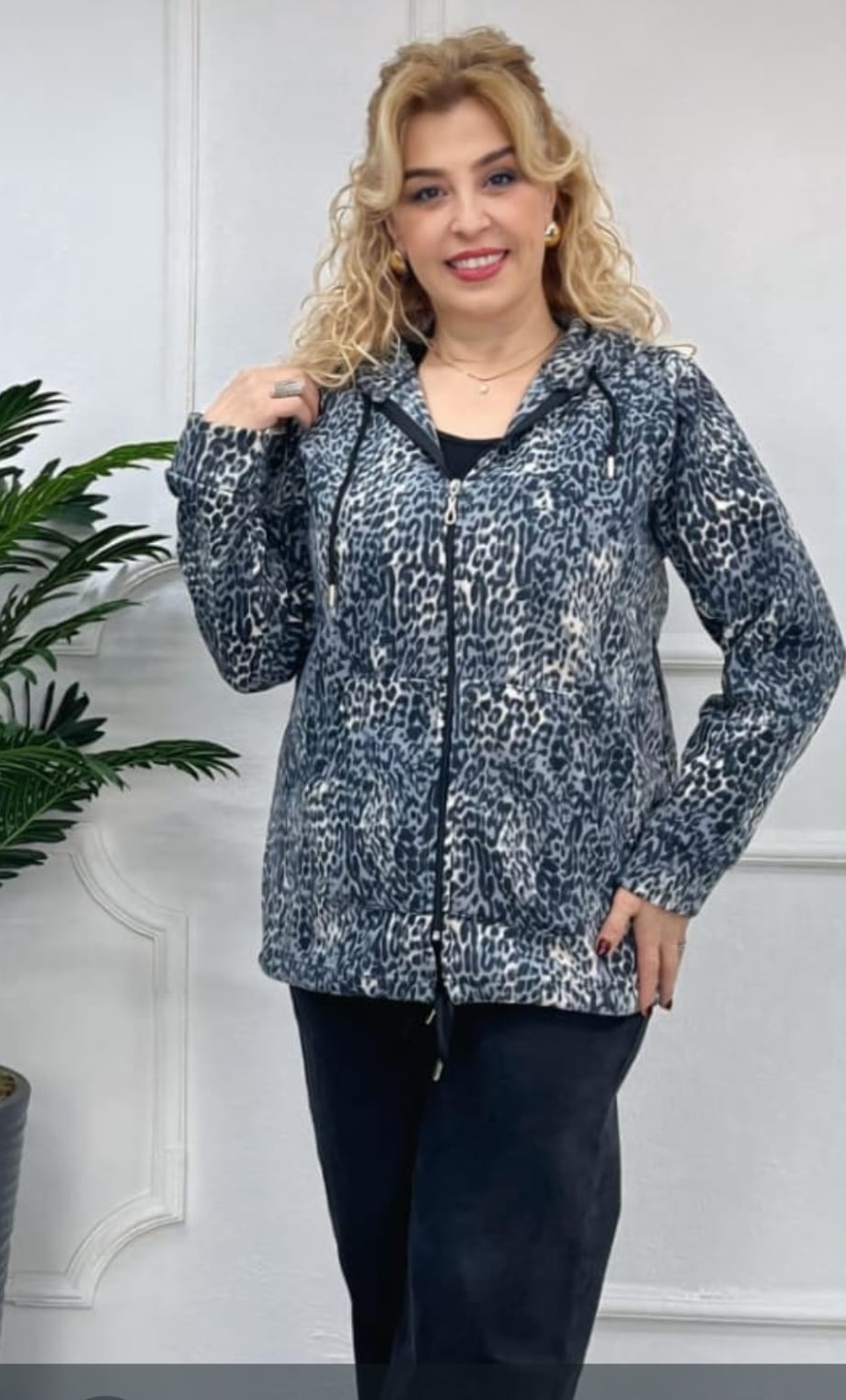 Siyah Gri Leopar Desenli Kapşonlu Büyük Beden Ceket